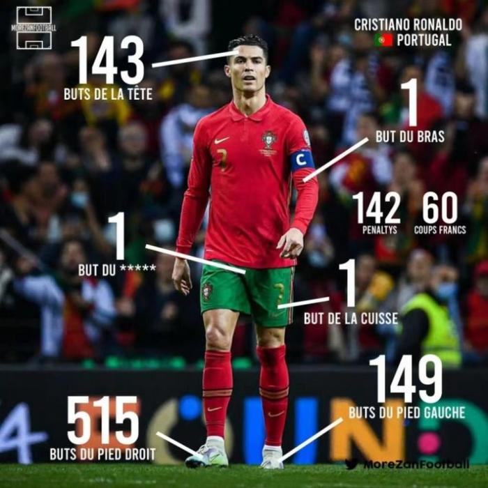 统计表明,C罗用头打进了143球,左脚打进149球,右脚打进515球,任意球打进6球,点球打进142球,手臂打进1球,左大腿打进1球,裆部打进1球。
