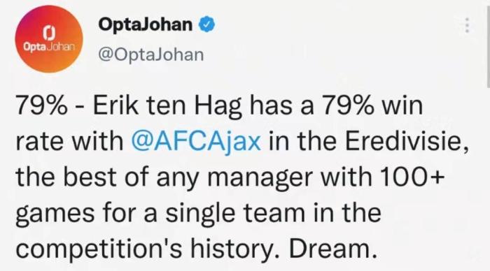 据Opta统计,自2017年12月执教阿贾克斯以来,滕哈格在荷甲的胜率高达79%,是历史执教单一球队(至少100场)教练中胜率最高的。