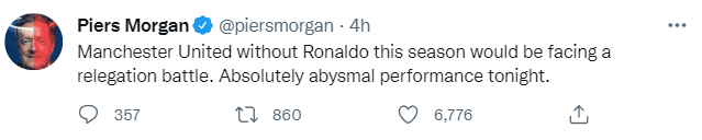 名嘴摩根赛后点评道:“如果曼联本赛季没有C罗,他们将面临降级的危险,今晚红魔的表现太差了。”