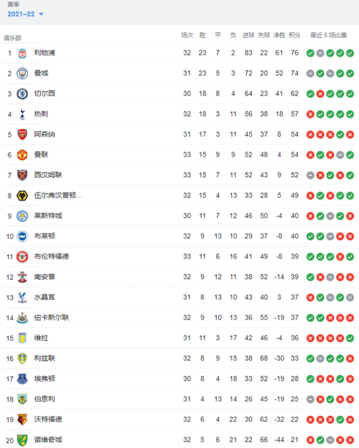 英超争冠和争四均进入白热化阶段,利物浦32轮积76分排名第一,曼城31轮74分第二,两队将重现此前的争冠大战。