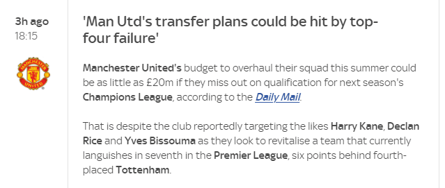 目前曼联排名英超第七,距离第四的热刺6分,晋级欧冠的希望渺茫。如果无缘欧冠,他们重建的预算可能只有2000万英镑。