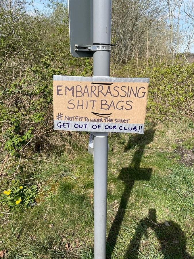 有曼联球迷在卡林顿基地外的路牌上挂了手写标语:“令人尴尬的废物,不配穿曼联球衣,滚出我们的俱乐部!”