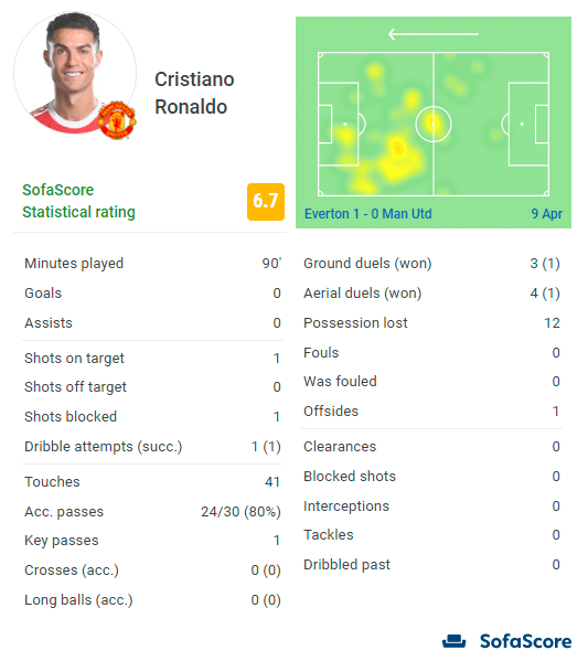 178直播04月10日讯 ,曼联0-1不敌埃弗顿,C罗首发并踢满全场。赛后,SofaScore显示C罗仅一次射正,12次丢掉球权,仅得6.7分。
