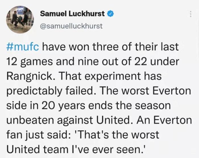 卢克赫斯特写道:“在朗尼克的带领下,曼联在过去的12场中赢了3场,22场中赢了9场。可以预见的是,这次试验失败了。近20年表现最糟糕的埃弗顿,在本赛季对曼联保持不败。一位埃弗顿球迷刚刚说:‘这是我见过最差的曼联。’”