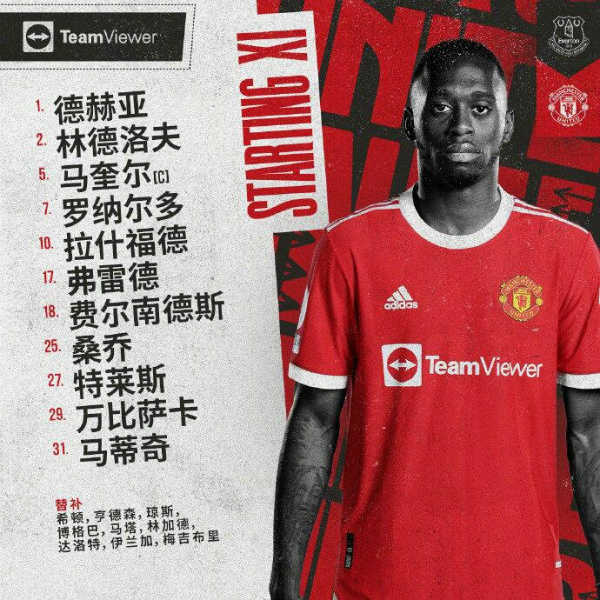 曼联首发:1-德赫亚、29-万比萨卡、2-林德洛夫、5-马奎尔、27-特莱斯、31-马蒂奇、17-弗雷德、18-B费、25-桑乔、10-拉什福德、7-C罗