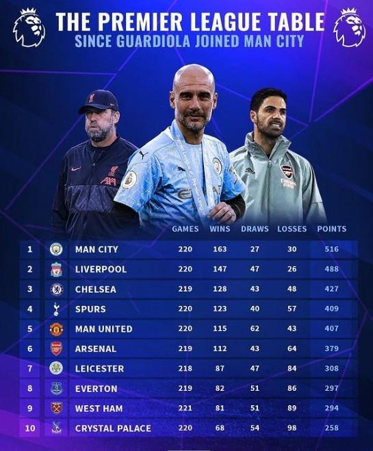 178直播04月09日讯 ,德转统计了自瓜迪奥拉2016年7月执教曼城以来英超各队的积分情况,曼城以516分遥遥领先,利物浦、切尔西位列第二第三。