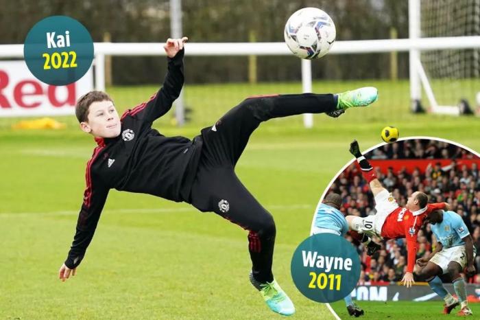 凯伊在曼联青训体系的成绩单,包括对利物浦完成大四喜、6-3胜斯托克城时3传3射上演双重帽子戏法。而在曼联青训营的训练中,凯伊·鲁尼还尝试模仿了其父的另一粒经典入球,对曼城的倒挂金钩。