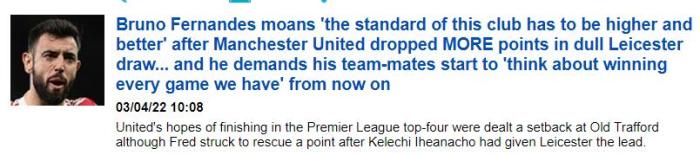 178直播04月04日讯 上周与曼联正式续约到2026年的布鲁诺·费尔南德斯,原本还豪气干云,宣称要在俱乐部赢得伟大成就。然而,续签后首场比赛,B费和队友就遭受挫折,主场1-1与莱斯特城战平,积分已经跌落至英超第7位。赛后,费尔南德斯非常不满,要求曼联提升标准,队友必须每场比赛都力争取胜。