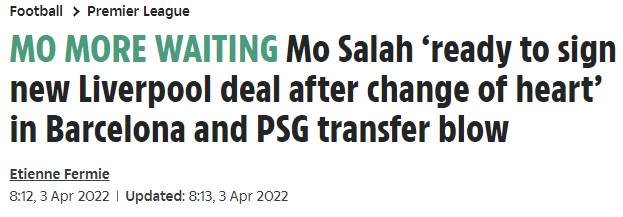 萨拉赫现在愿意降低薪资要求。利物浦最初提供的续约合同为期3年,双方商议的新条款包括一年续约选择权,这意味着他可能终老安菲尔德。