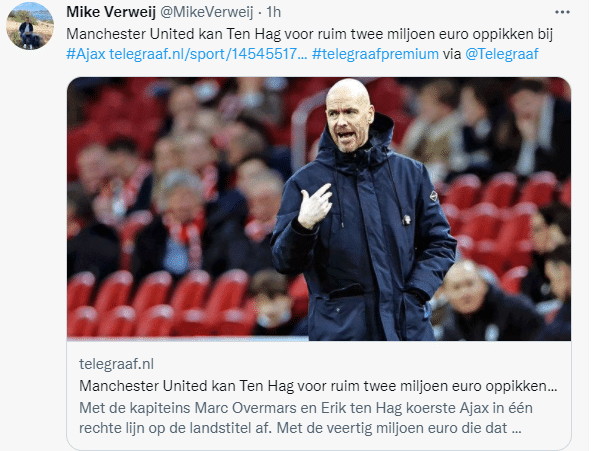 178直播04月02日讯 消息,荷兰记者MikeVerweij在荷兰《电讯报》中透露,阿贾克斯主帅滕哈格是曼联下任主帅头号人选。