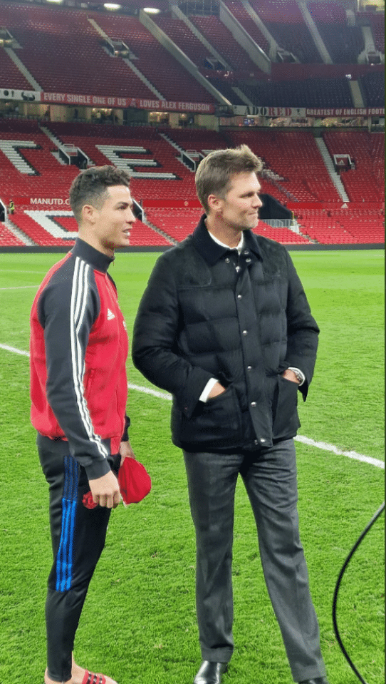 赛后,布雷迪也走下了看台,来到场边与赛后进行采访的C罗进行热聊。随性的C罗穿着曼联外套,穿着拖鞋手插兜与布雷迪侃侃而谈,两人谈笑风生了好长一段时间,聊到兴起时,双方还互相拍打肩膀,看起来交情不浅。随后,C罗还给布雷迪的儿子送上了礼物。