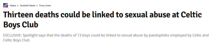 在因为自杀、暴力和毒品死亡的40名男孩中,有13人被确认在凯尔特人或凯尔特人青年俱乐部雇佣的恋童癖麾下踢球。