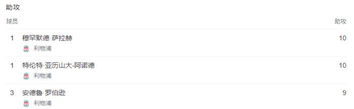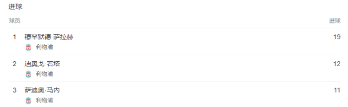 现在,利物浦球员已经包揽英超射手榜前三和助攻榜前三,萨拉赫19球居首,若塔12球第二,马内11球第三。助攻榜方面,萨拉赫和阿诺德10个助攻并列第一,罗伯逊9个助攻排名第二。
