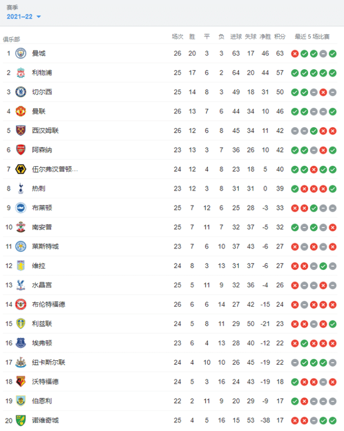 曼城输给热刺后26轮积63分仍排第一,而利物浦则少赛一轮57分排名第二,落后曼城6分。