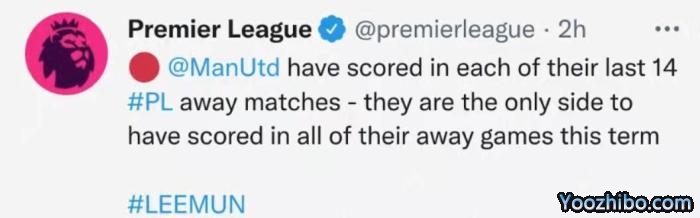 在本赛季14场英超客场比赛中都有进球,是唯一做到的英超球队。