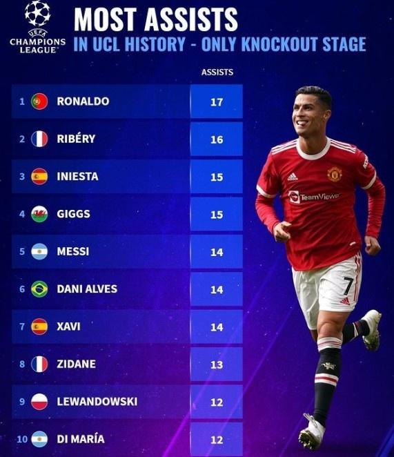 178直播02月18日讯 德国转会市场今日统计了欧冠联赛淘汰赛历史助攻榜,C罗17次助攻排名第一。