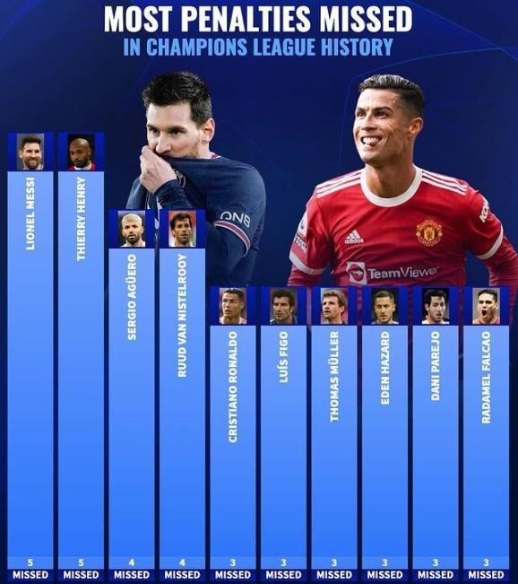 178直播02月17日讯 德国转会市场今日统计了欧冠历史失点排行榜,梅西和亨利以5球排名第一。