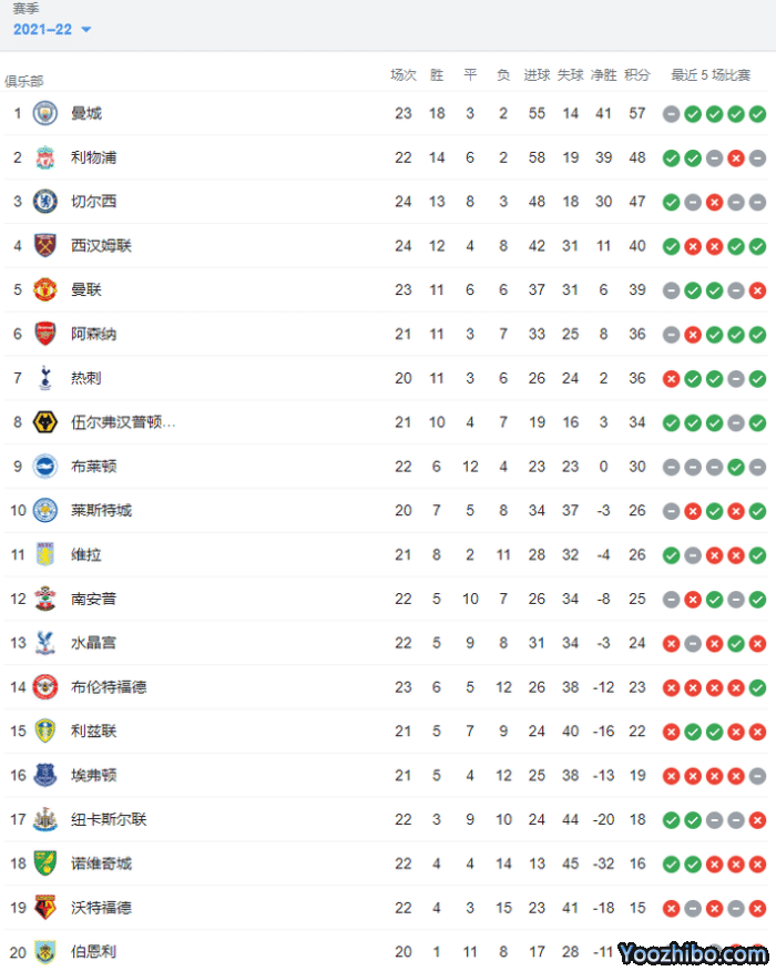 曼城23轮57分继续领跑积分榜,利物浦少赛一轮48分排第二,切尔西24轮47分排第三。