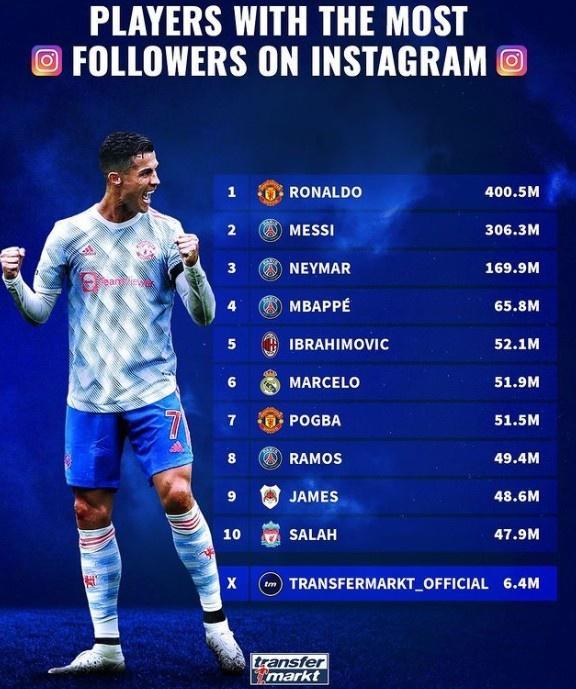 178直播02月07日讯 德国转会市场网统计了足坛Instagram粉丝最多的球星,C罗4亿独自领跑,梅西3亿排名第二。