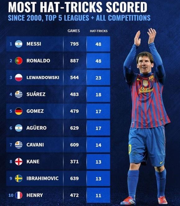 新世纪以来,梅西和C罗在五大联赛均有48次戴帽,但梅西所用场次更少,为795场,C罗则用了887场。