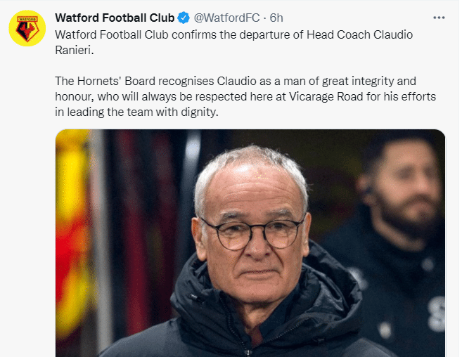 178直播01月25日讯 据沃特福德官方消息,一线队主教练拉涅利下课。