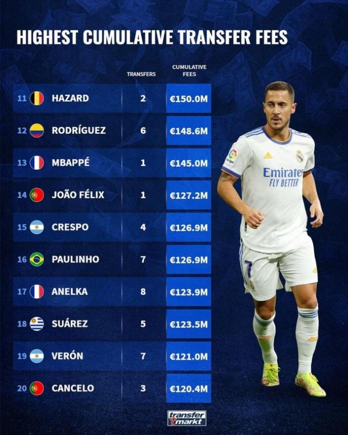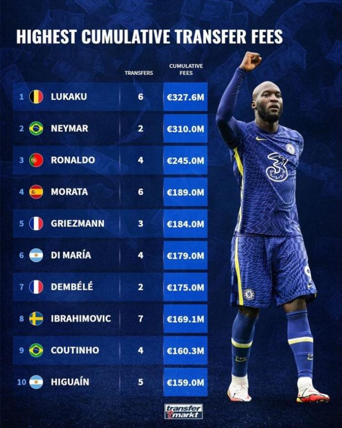 178直播01月21日讯 德国转会市场统计了足坛球员的累计转会费排行榜,卢卡库6次转会共累积3.27亿欧元,排名第一。