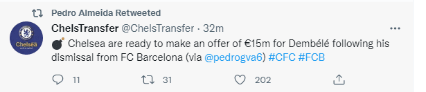 178直播01月21日讯 葡萄牙记者佩德罗-阿尔梅达消息,切尔西准备在冬窗1500万欧元求购巴塞罗那球星登贝莱。