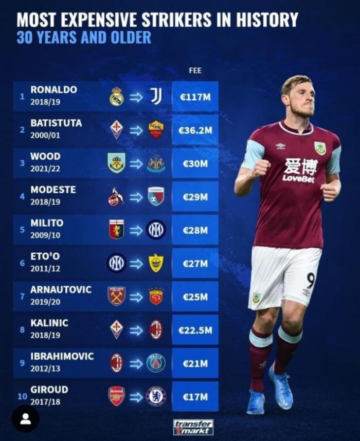 178直播01月14日讯 ,纽卡斯尔联官方宣布从伯恩利签下新西兰中锋克里斯-伍德。据德国转会市场网透露,克里斯-伍德的转会费在30岁以上前锋中排在第三,仅次于C罗和巴蒂。