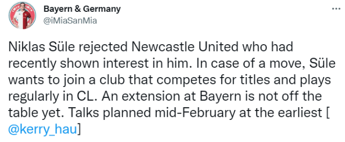 178直播01月14日讯 据sport1记者KerryHau报道,拜仁中卫聚勒拒绝了纽卡给出的报价。
