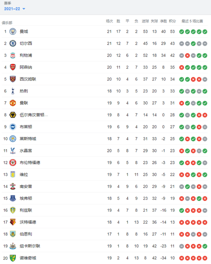 曼城目前21轮积53分排名第一,领先第二名的切尔西10分,领先第三名但少赛一轮的利物浦11分。