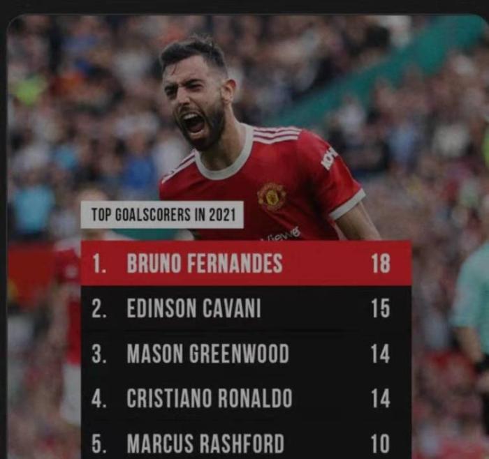 178直播01月02日讯 2021年,B费总计为曼联出场58次贡献18球,卡瓦尼15球排在第二位,格林伍德打入14球排在第三位,夏窗加盟的C罗打入14球,拉什福德10球排在第5位。