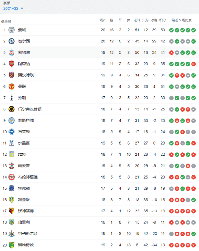 曼城20轮50分领跑积分榜,第二名的切尔西20轮积42分,利物浦则少赛一轮,积41分暂居第三。