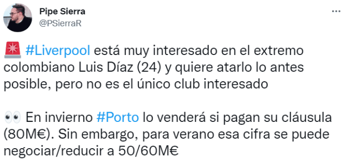 路易斯-迪亚斯目前效力于波尔图,该记者表示,利物浦对这名哥伦比亚边锋很感兴趣,但如果冬窗就想签下的话,需要支付8000万欧元的违约金。