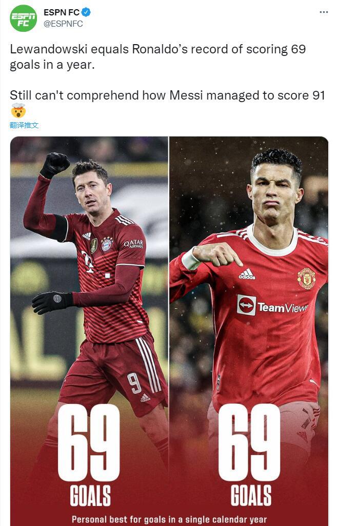 178直播12月19日讯 消息,莱万对沃尔夫斯堡破门后,追平C罗的年度69球纪录,ESPN感叹不知道梅西年度91球是怎么做到的。