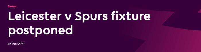 178直播12月17日讯 ,英超联赛官方宣布,本轮莱斯特城主场与热刺的联赛推迟。