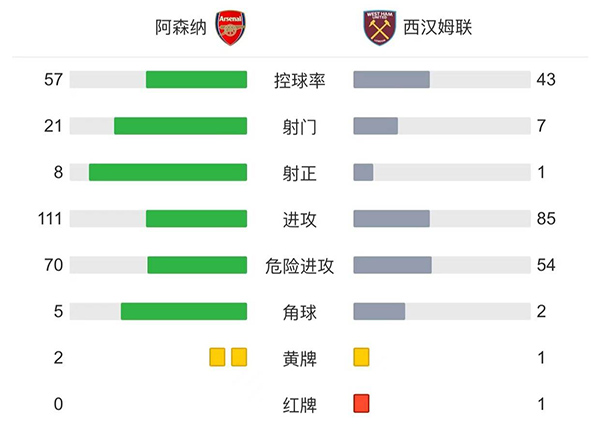 全场比赛结束,阿森纳2-0力克西汉姆联。