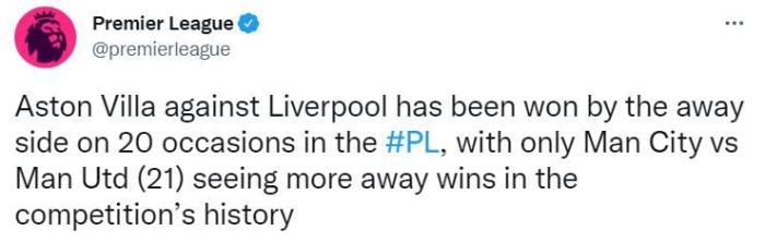 178直播12月11日讯 赛前,据英超官方统计,维拉在英超时代作客安菲尔德共取得20场胜利,英超时代作客单一球队取胜次数第二多,只比曼城客胜曼联的21次少。