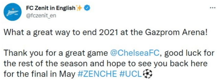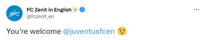 泽尼特官推在赛后也调皮了一把,先是表达了对切尔西的祝福,随后又告诉尤文不客气。