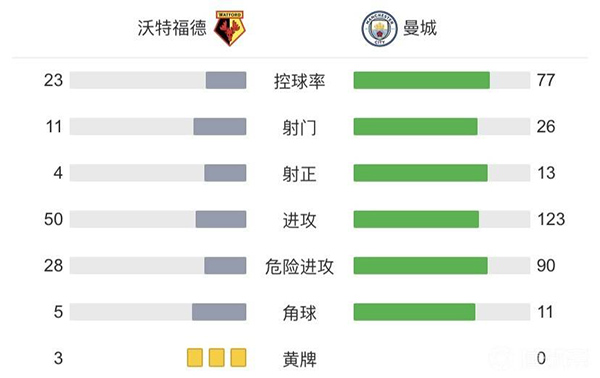 全场比赛结束,曼城3-1沃特福德。