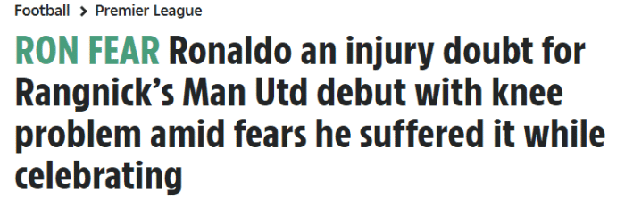 《太阳报》表示,在曼联3-2战胜阿森纳的比赛中,C罗帮助曼联打进制胜的点球,随后他做出了自己标志性的庆祝动作,但是葡萄牙人在落地时可能伤到了膝盖。