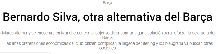 178直播11月27日讯 据西班牙媒体《每日体育报》报道,除了斯特林和费兰-托雷斯外,巴萨还在关注曼城的边锋贝尔纳多-席尔瓦。