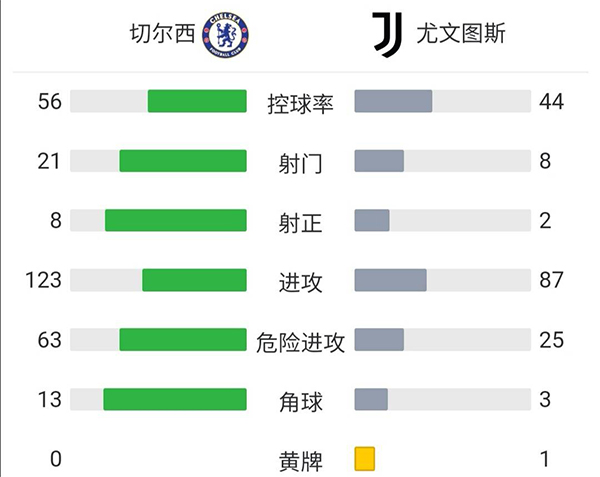 第56分钟,奇尔韦尔前场左路高空球横传到禁区内,前点尤文图斯球员头球顶了一下,里斯-詹姆斯后点胸部停球后小角度抽射破门,2-0!