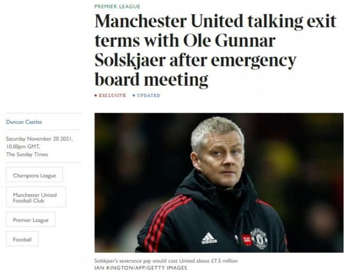 178直播11月21日讯 据《泰晤士报》记者邓肯-卡斯尔斯报道,在今天凌晨1-4惨败沃特福德后,曼联高层召开了紧急会议,并决定解雇索尔斯克亚,索帅将拿到大约750万英镑的解约金。