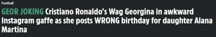 178直播11月20日讯 据英国媒体《太阳报》报道,C罗的女友乔治娜在个人社交媒体发布了一段为女儿庆生的视频,却把出生日期写错了。