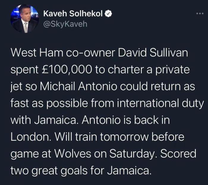 该记者表示,为了让他们的主力中锋安东尼奥尽快从牙买加返回,西汉姆联的老板大卫-沙利文花费了10万英镑租了一架私人飞机。西汉姆联将在周末的比赛中对阵狼队,安东尼奥在回来之后需要尽快投入训练。