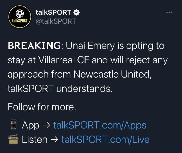 该媒体表示,埃梅里选择留在比利亚雷亚尔继续执教,同时拒绝了纽卡斯尔联队的邀请。