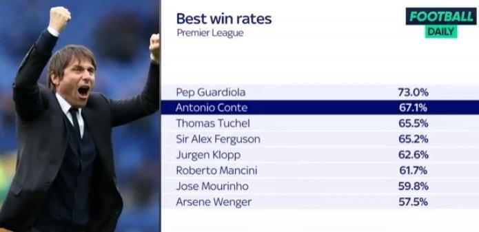 178直播11月03日讯 热刺昨晚官宣孔蒂成为球队新帅,据FootballDaily统计,这位意大利教头在英超的胜率排名历史第二。