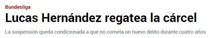 178直播10月28日讯 据《马卡报》等多家西班牙媒体报道,法国后卫卢卡斯-埃尔南德斯无需入狱服刑,只需缴纳9.6万欧元罚款同时保证自己4年内不再犯罪。
