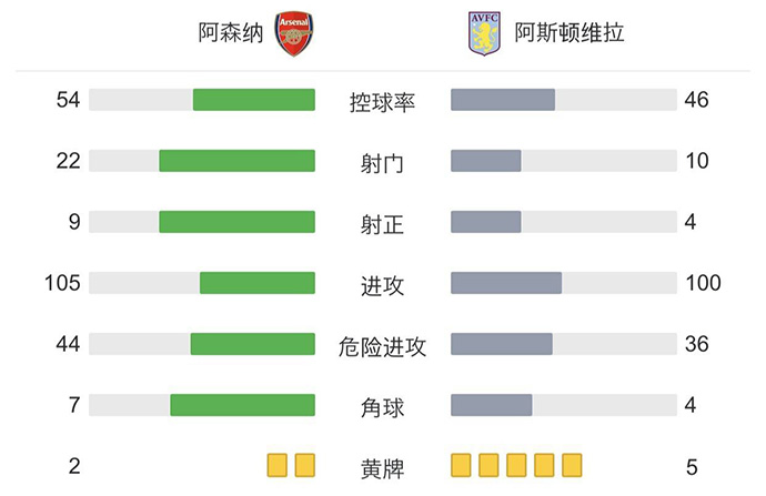 第45+6分钟,奥巴梅扬主罚点球,马丁内斯第一下将球扑出,但奥巴梅扬跟进左脚补射得手,阿森纳2-0阿斯顿维拉。