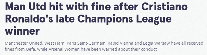 C罗读秒绝杀黄潜后,一些球迷冲进场内,双方球迷还互相投掷杂物,曼联因此被罚款7050英镑。西汉姆、巴黎圣日耳曼和华沙列日等也因为球迷不冷静的行为被罚款。C罗绝杀黄潜后,再次绝杀亚特兰大,为红魔拿到6分。